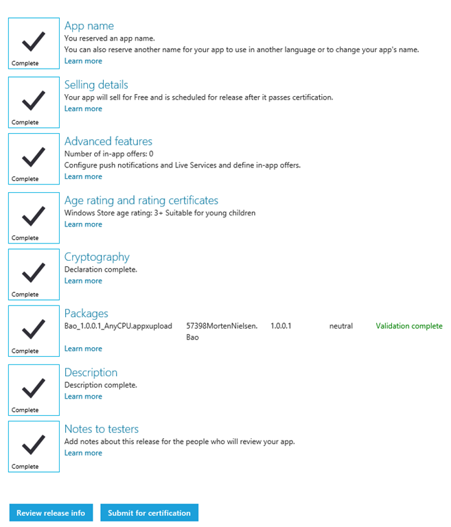 The next step is the age rating. Make sure you read the “small” print. If your app has access to the internet, chances are you can’t go with the lowest rating, no matter how PG your app is. Also note that for some countries a rating certificate is required to be able to publish there (I have no clue how to get these though):
