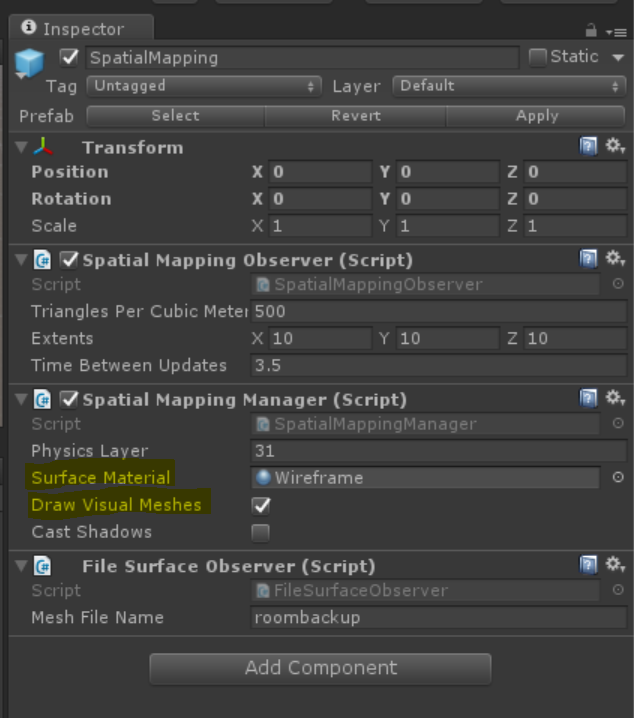Select the added “SpatialMapping” object, and ensure “Draw Visual Meshes” is checked on. The default material is the “Wireframe”. Feel free to experiment with other materials.